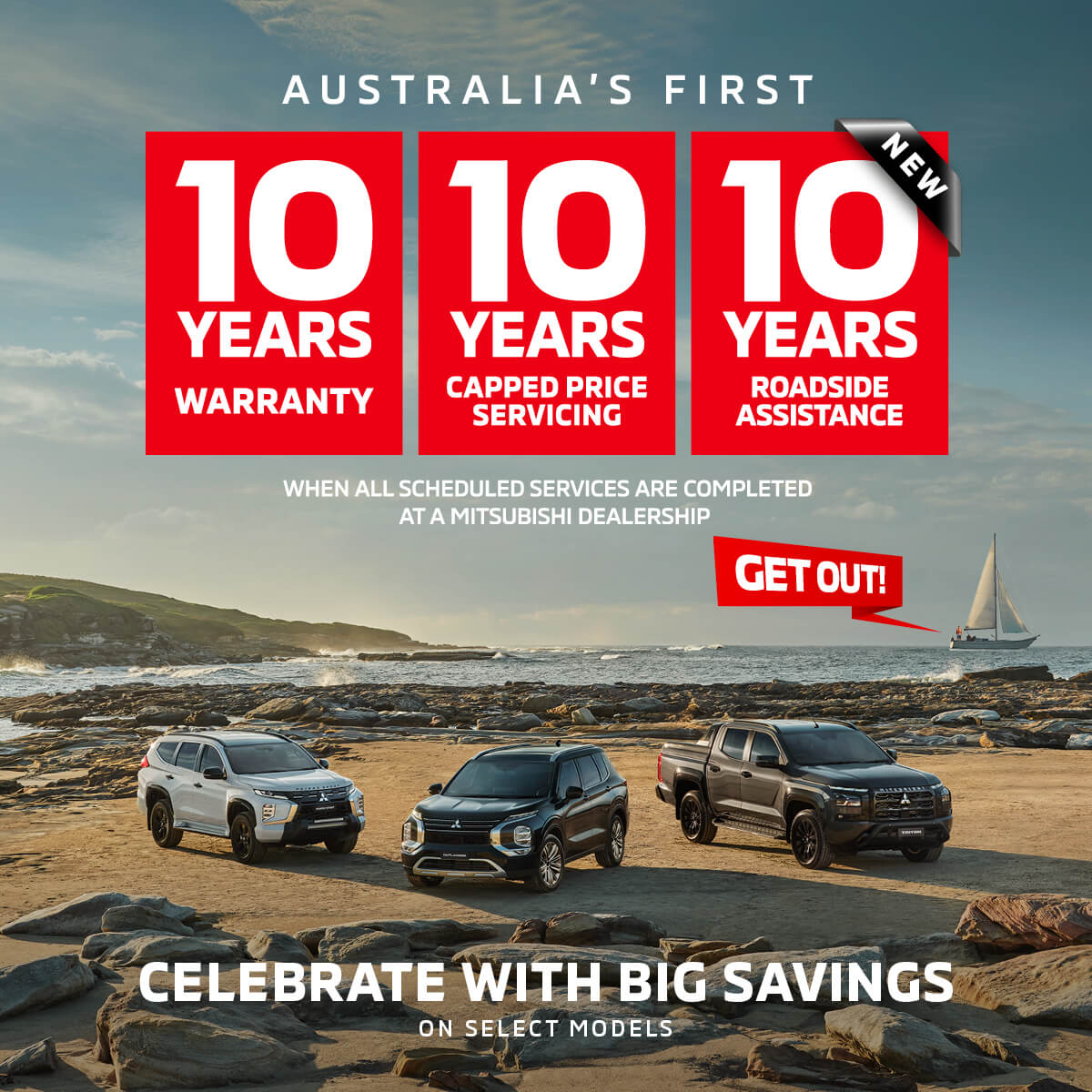 Mitsubishi’s legendary 10 Year Warranty⋄1 with 10 Years Capped Price Servicing⋄2now includes 10 Years Roadside Assistance⋄3. We’re celebrating with unmissable drive away prices on select models while stock lasts.