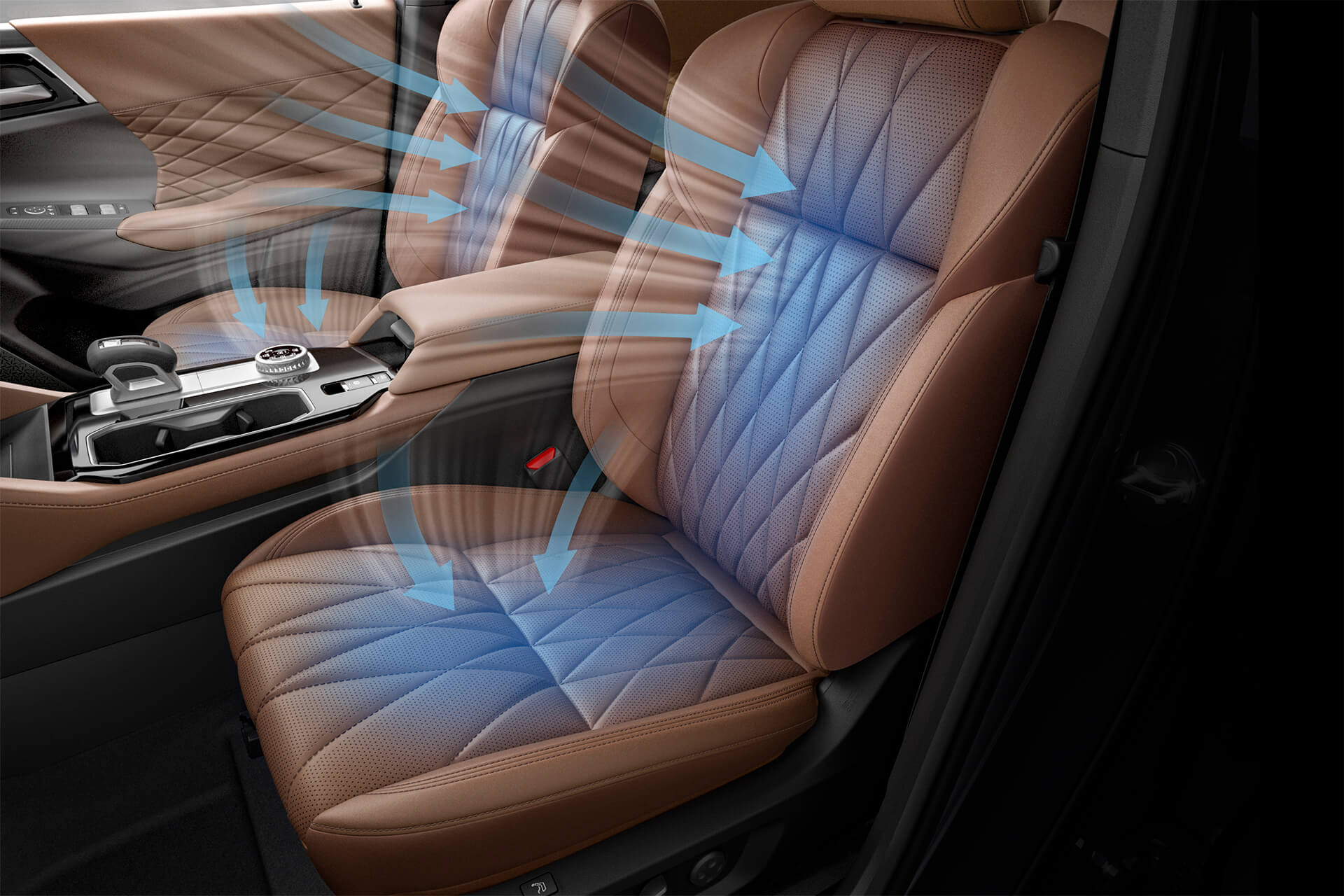 Plus, with show-stopping leather upholsteryO11 and embedded comfort features, you can vibe out in style. Heated seats in the frontO8 and 2nd rowO17 provide welcome winter warmth, while independent tri-zone climate controlO11 allows everyone to ride their own way.